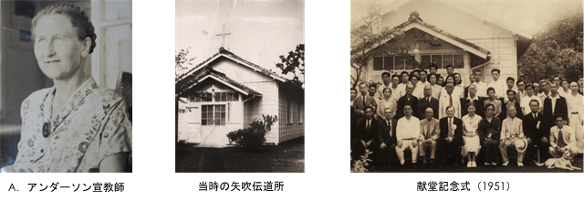 1949年には本川牧師に加えてアイリン・アンダーソン宣教師の支援によって伝道の輪は広がりを見せ、その翌々年には初めての教会堂を矢吹の町に建てるに至りました。